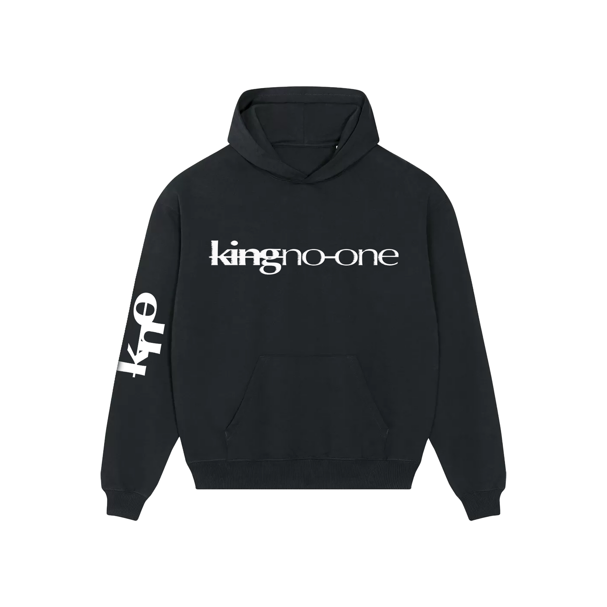 Black hoodie with King No-One logo chest print and white KNO sleeve print.